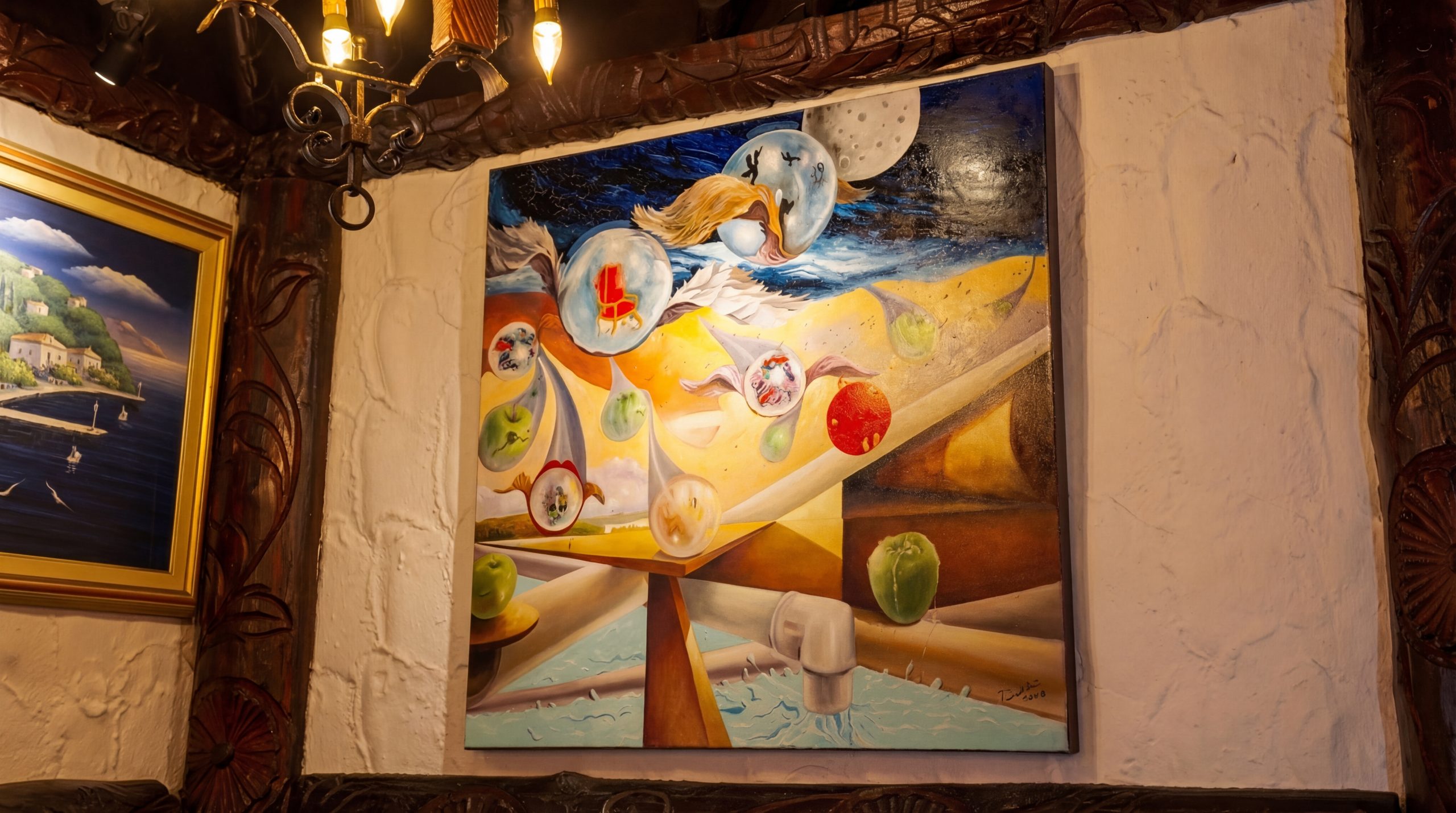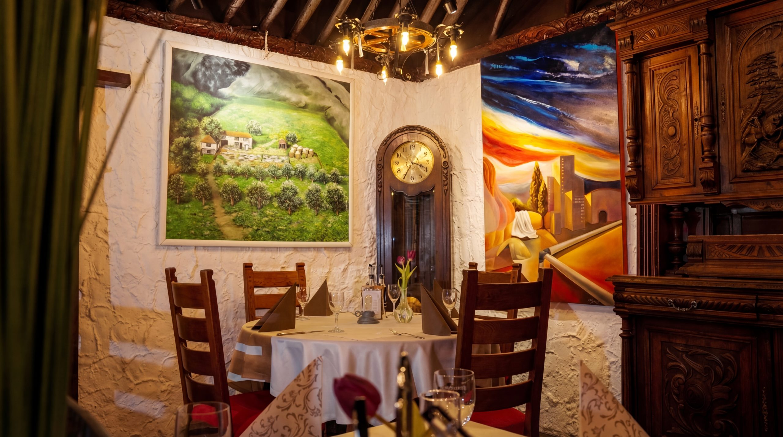 Die Wände sind geschmückt mit einzigartigen, handgemalten Kunstwerken eines bekannten italienischen Künstlers, die dem Raum Charakter und eine ganz besondere Tiefe verleihen.
